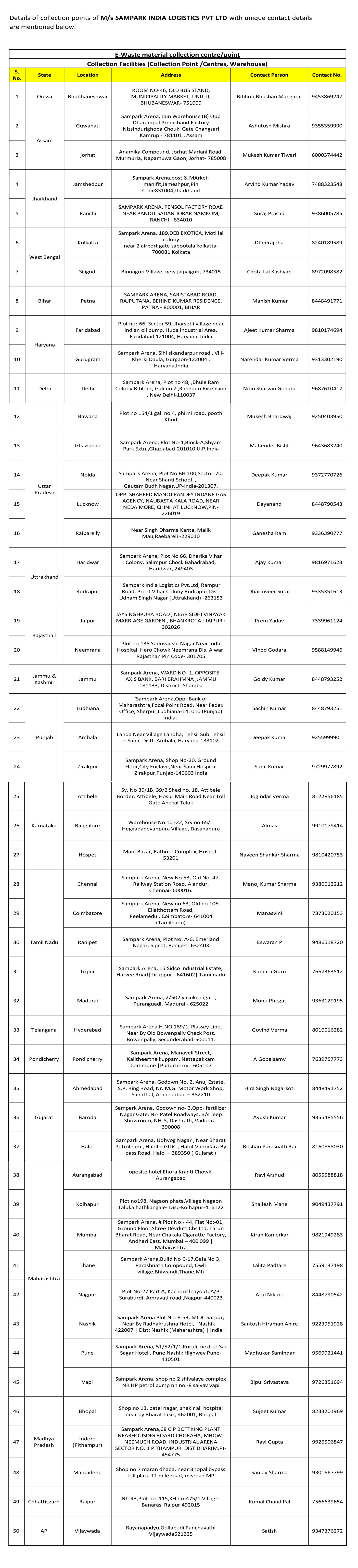M/s SOLUTION BUCKET LLPwill collect the E-Waste on behalf of producer from PAN India Level, & their logistics partner M/s SAMPARK INDIA LOGISTICS PVT LTD registered at“Sampark Arena” 52, Jaidev Park, Punjabi Bagh East, New Delhi-110026will transport the E-Waste collected to M/sECO SAVIOUR E-WASTE MANAGEMENT PRIVATE LIMITEDrecycling plant facility situated at H.No. C-351,352,Ansal Pioneer, Industrial Park, Bilaspur, Manesar, Gurugram,Haryana,122051.